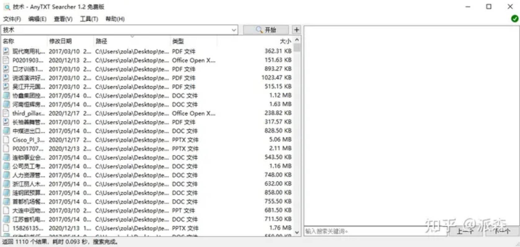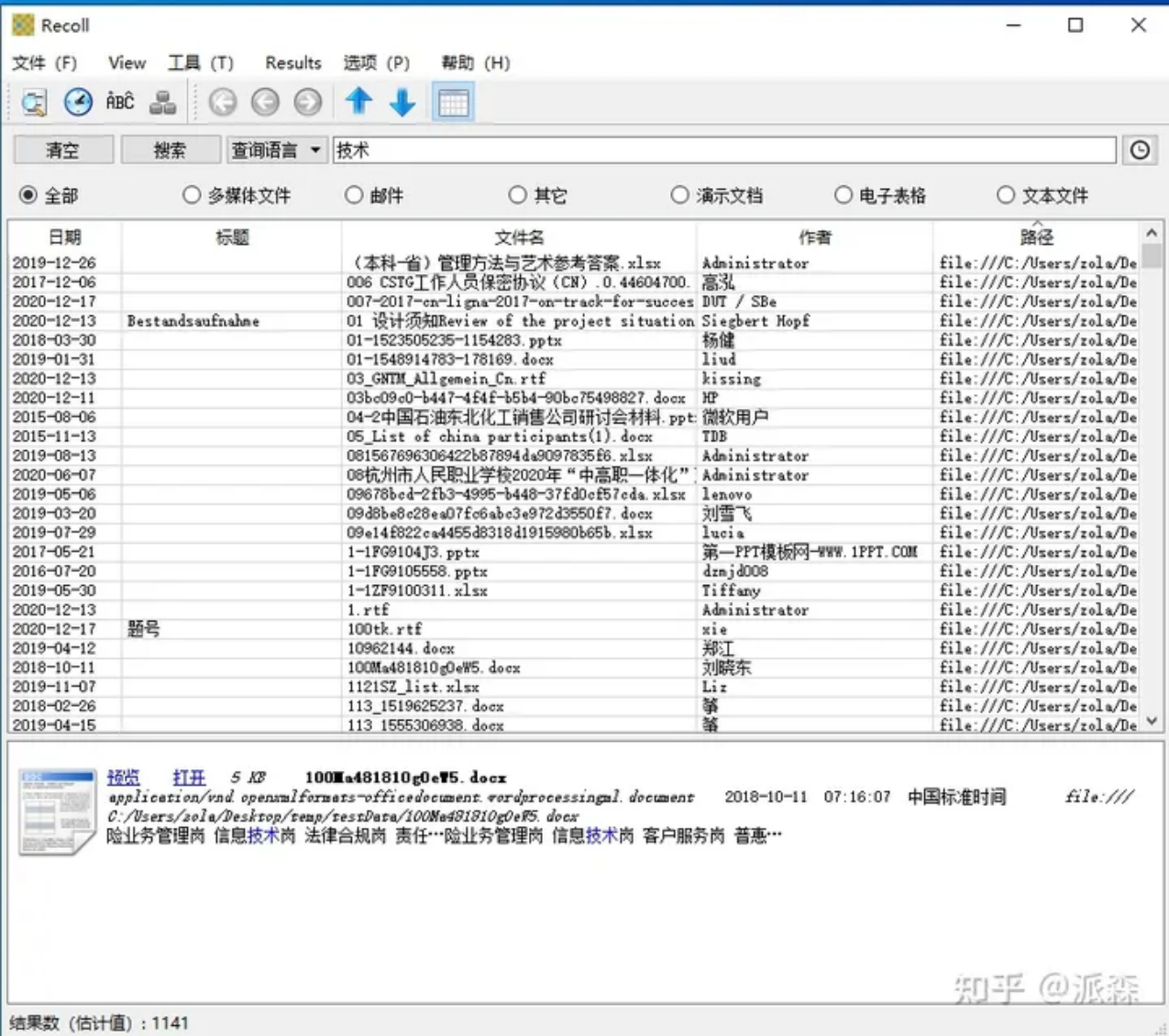 经过简单的测试,我们发现其中9款软件对中文的支持很糟糕,这些软件后续就不再做进一步测试。以下是这些软件搜“技术”一词的结果(基准数为1206个):